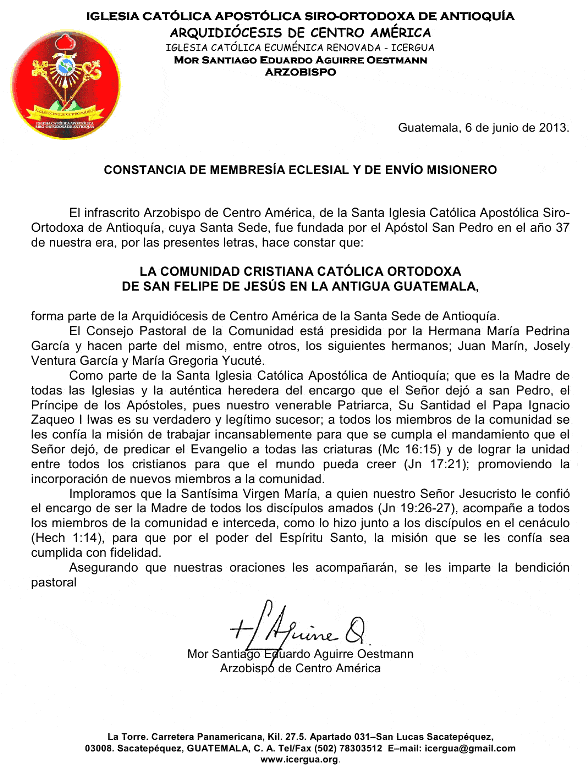 El jueves seis de junio, Mor Santiago Eduardo, recibió a una delegación de la Comunidad Cristiana Católica Ortodoxa de San Felipe de Jesús en la Antigua Guatemala. Esta comunidad se comenzó a formar desde hace tres años y finalmente, después de la perseverancia de sus coordinadores y el apoyo de los seminaristas que hacen pastoral los fines de semana, la comunidad ha comenzado a consolidarse y crecer en los últimos tiempos. Son numerosas las conversiones que se han tenido. Aunque la comunidad no cuenta aún con un templo para reunirse, sino lo hace en las casas de sus miembros, está dando un hermoso testimonio de fe en medio de la comunidad. El Consejo Coordinador pidió al Arzobispo que les extendiera una Constancia de Pertenencia y de Envío Misionero, para poder identificarse plenamente cuando hacen la obra misionera. A continuación publicamos en foto y en PDF la constancia extendida. |