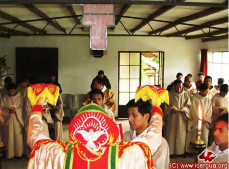 A la derecha el hermano Martín. Profesor de Química, de la Universidad Nacional Autónoma de Nicaragua, ha sentido la vocación para las órdenes sagradas desde hace muchos años. Ahora él fue admitido como candidato a las órdenes sagradas, asumiendo el compromiso de organizar una capellanía para la atención a los estudiantes y otras comunidades, así como de proseguir su formación teológica. |