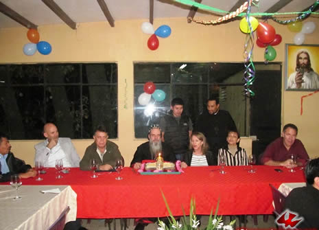 Además de los formadores y los seminaristas, fueron invitados a la celebración los hermanos del Arzobispo y otros amigos. En la foto de la derecha: Padre Pedro Martínez, párroco de Cuilco, Gerardo Aguirre, Enrique Pablo Aguirre, el Arzobispo, Ilena Aguirre, Emmy de Aguirre, Federico Aguirre y al extremo derecho, visible en la foto de arriba pero no en ésta, Luís Madrid. En la segunda plana, padres Juan Moisés y Ángel Antonio, formadores en el seminario. |