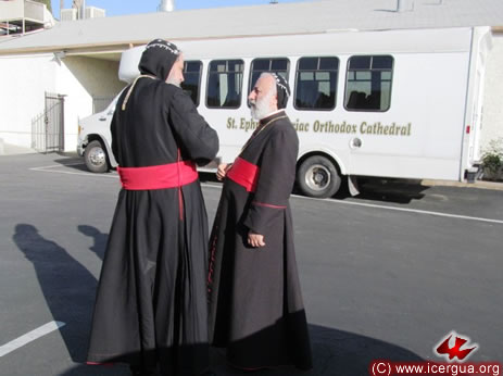 El domingo por la tarde y por la noche, fue tiempo para intercambio entre los diferentes Arzobispos que al día siguiente participarían en el Santo Sínodo de elección. A la izquierda Mor Crisóstomo Juan Gasali, Arzobispo de Argentina y Mor Crisótomo Marcos, Arzobispo del Movimiento Evangelístico de la India. En el centro está nuestro Arzobispo, Mor Santiago Eduardo. |