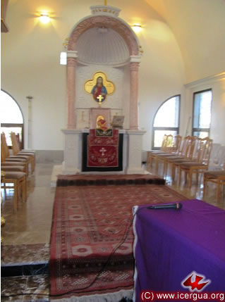 A la derecha: cerca del altar mayor de la capilla patriarcal, Mor Clemis, Mor Santiago Eduardo y al extremo derecho, ornamentos de la misa utilizados por Su Santidad, cubren la sede patriarcal que se encuentra en la capilla.