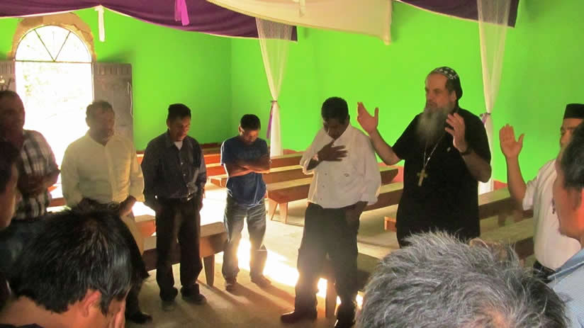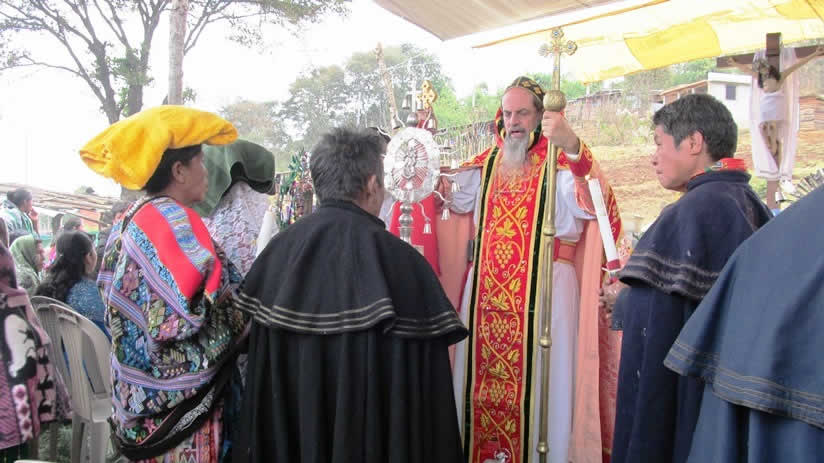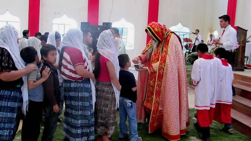 El domingo de Ramos, la actividad misionera de Mor Santiago Eduardo comenzó visitando la comunidad Nueva Jerusalén, del Centro urbano de San Mateo Ixtatán.