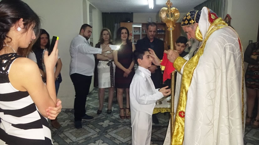 El sábado por la noche, Mor Santiago Eduardo llegó al hogar de una de las familias Batach, procedente de Siria, para celebrar la Divina Liturgia y administrar los sacramentos de la iniciación cristiana a Antonio, un niño de diez años.