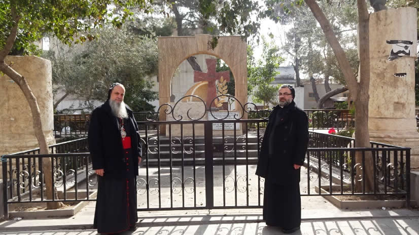 A pocos metros de la catedral, se encuentra un colegio y una misión de los jesuitas. Durante la ocupación de los terroristas, fue masacrado un misionero jesuita, el Padre Franz, que había pasado más de 40 años en Siria y era respetado y amado por todos. Se le considera mártir. En la foto 8, Mor Santiago Eduardo en el lugar del martirio y de la tumba, junto al Padre Miguel Daruf, jesuita, superior de la casa.
