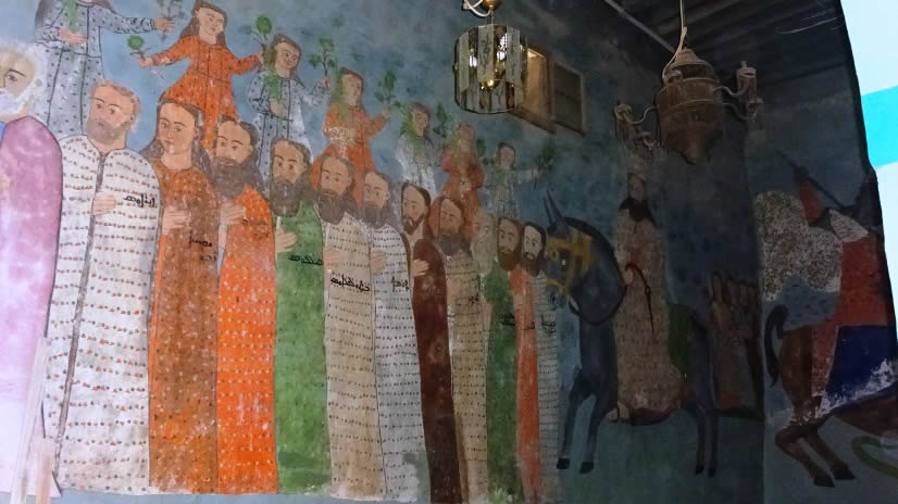 Se visitó la Iglesia más antigua, levantada sobre los vestigios de un templo pagano. La parte más antigua data del siglo III, aunque se le fueron añadiendo diversas partes posteriormente. Está dedicada a San Jorge. Está decorada con una serie de frescos que reflejan las técnicas de pintura que se utilizaron hace algunos siglos entre los cristianos de Siria. (fotos 5-7)