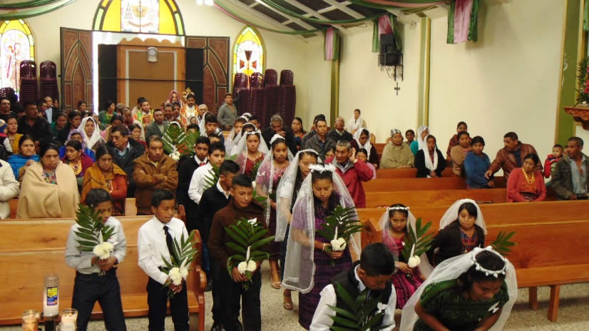 El templo se encontraba muy adornado, porque para la comunidad se trataba de una ocasión muy especial: cuatro niños recibieron los sacramentos de la iniciación cristiana y tres parejas de jóvenes contrajeron santo matrimonio.