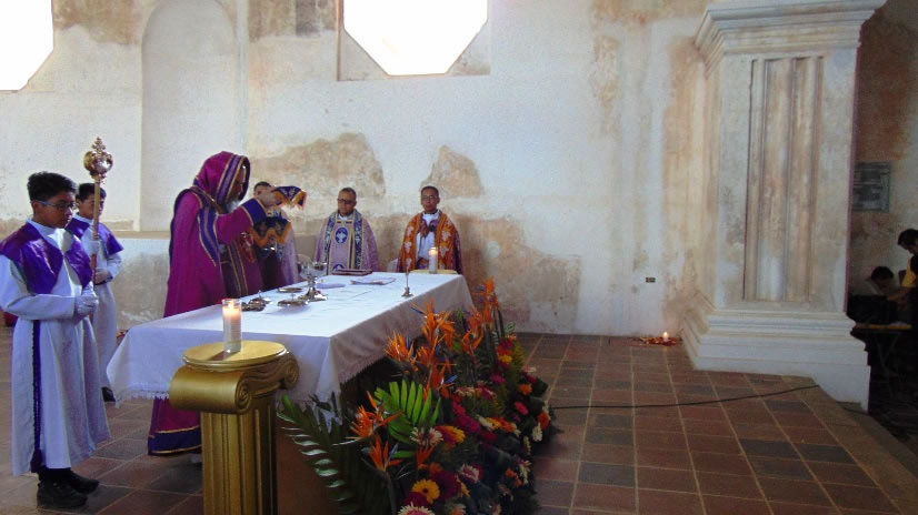 Antes del mediodía, tuvo lugar la celebración de la santa misa en la Iglesia que, habiendo sido construida en tiempos de la colona, quedó destruida durante el terremoto del 1976 y después de más de cuarenta años, finalmente pudo ser habilitada en su totalidad, aunque aún faltan muchos aspectos de concluir.