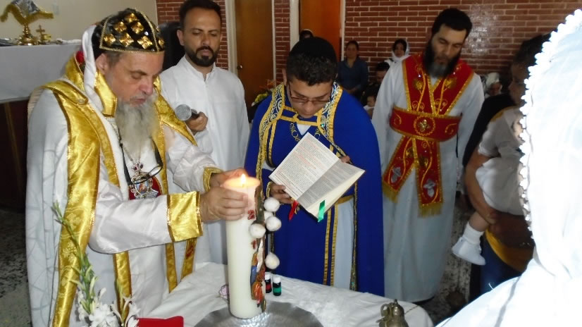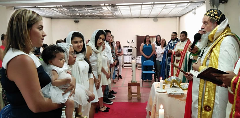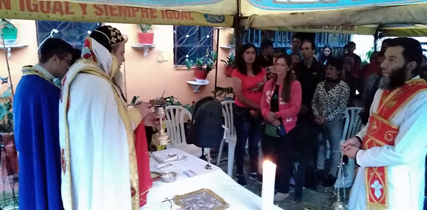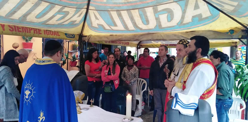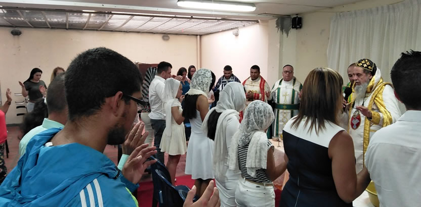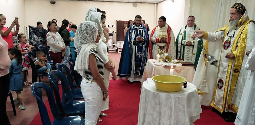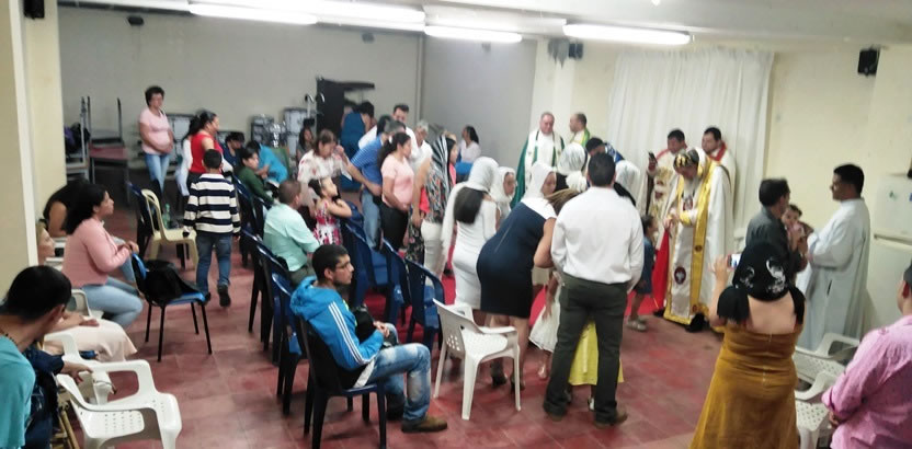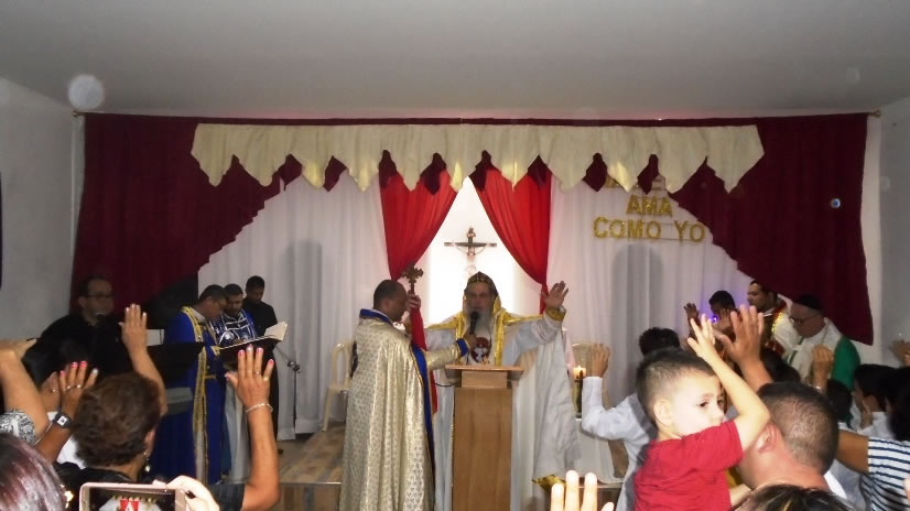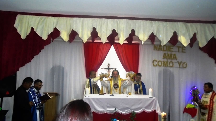 El padre Germán, junto a más de 200 fieles, se reunieron para recibir al arzobispo y para la celebración de la Divina Liturgia, en un salón, debido a que la parroquia aún no cuenta con instalaciones propias.