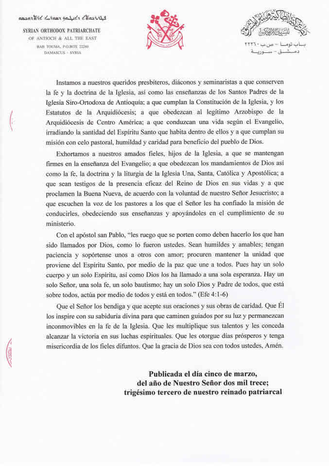 En ese día, después de haber recibido el parecer favorable del Santo Sínodo de Antioquía, Su Santidad Ignacio Zaqueo I Iwas, ordenó como monje y le dio el nombre de Yaqub (Santiago) a Monseñor Eduardo Aguirre Oestmann, se creó la Arquidiócesis de Centroamérica y a Mor Santiago Eduardo Aguirre Oestmann, se le nombró como su primer arzobispo.