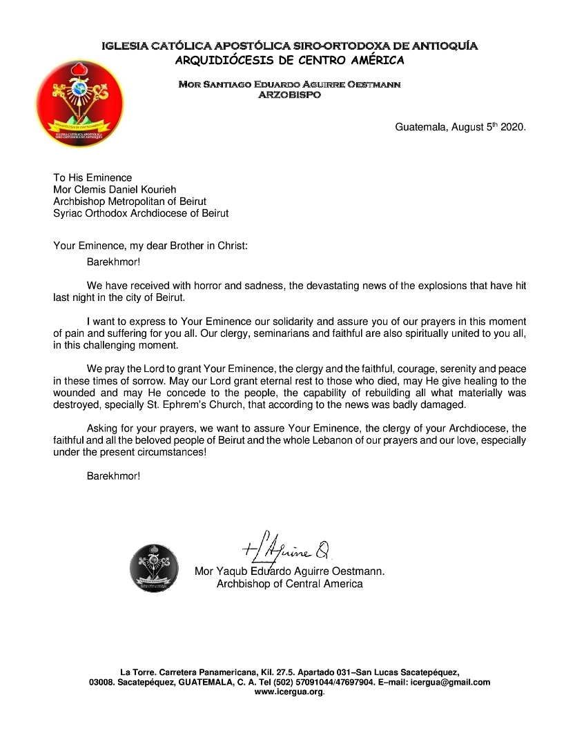 Nuestro arzobispo Mor Santiago Eduardo, en nombre de la Arquidiócesis de Centroamérica, ha escrito una carta de solidaridad a Su Eminencia el arzobispo de Beirut, en la cual le asuguramos de nuestra solidaridad, de nuesto amor y de nuestras oraciones.