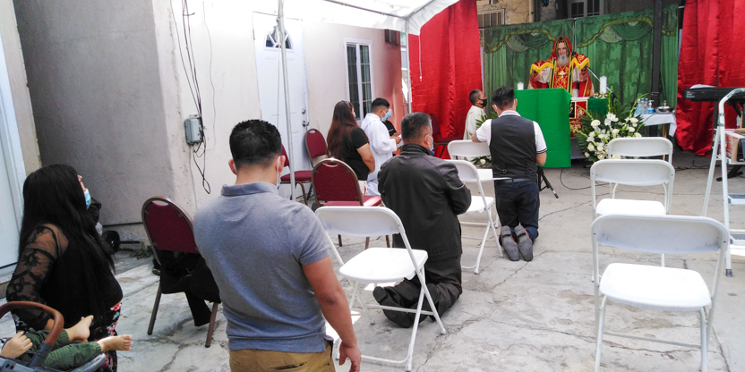 De acuerdo a las normas sanitarias que están en vigencia en el Condado de Los Ángeles, la celebración de la liturgia tuvo lugar en un área abierta, adyacente al templo.