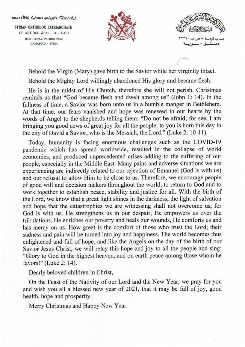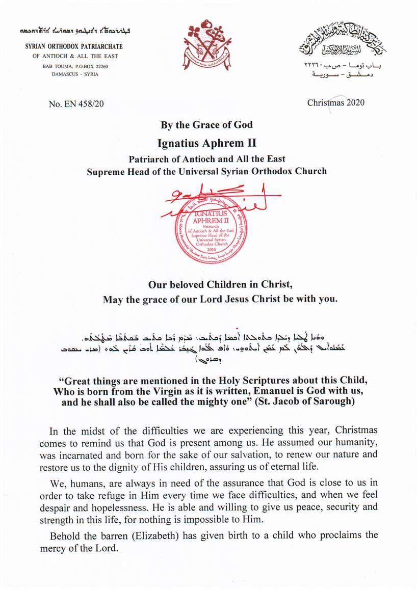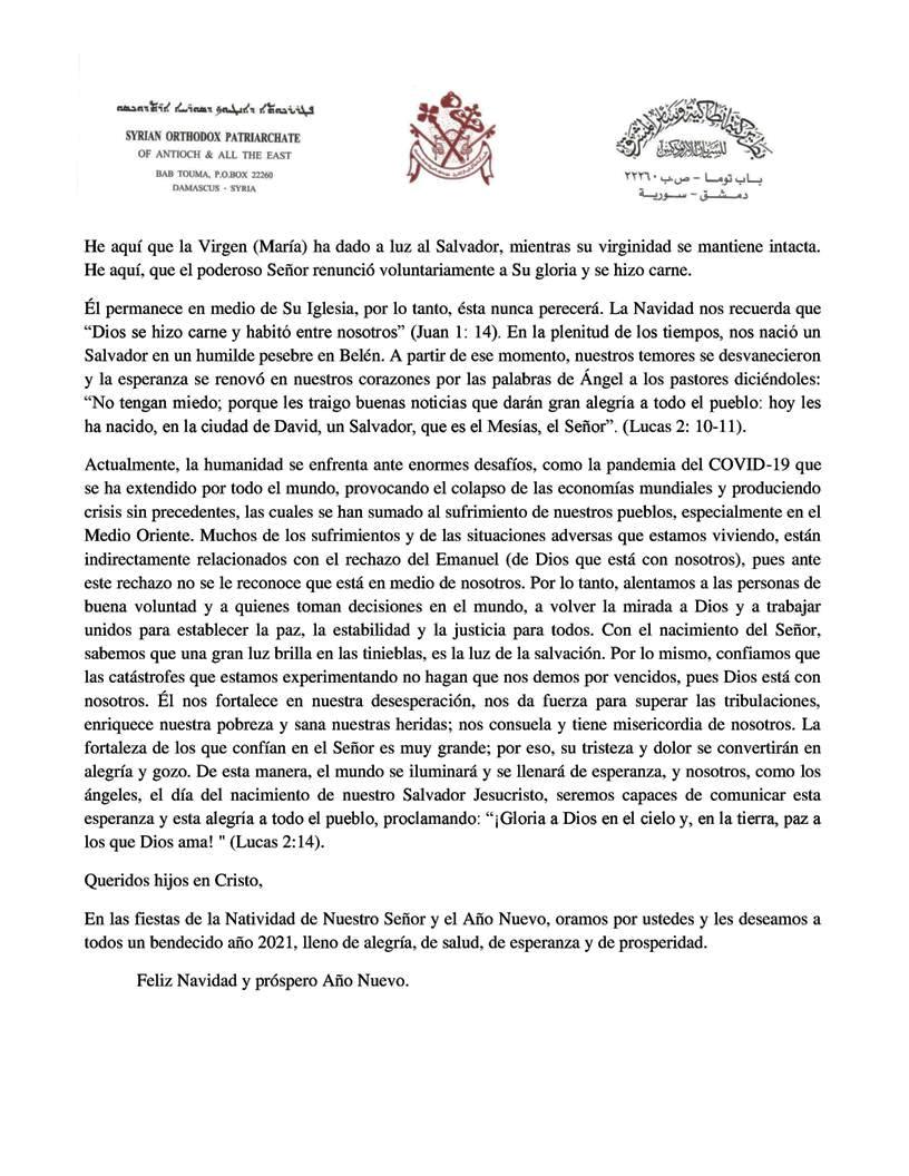 El día de hoy, 24 de diciembre, hemos recibido la Carta-Mensaje de Su Santidad Ignacio Efrén II, Patriarca de Antioquía y de todo el Oriente, con ocasión de la Navidad y del Año Nuevo.