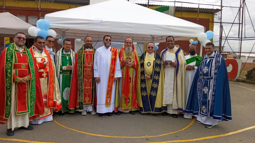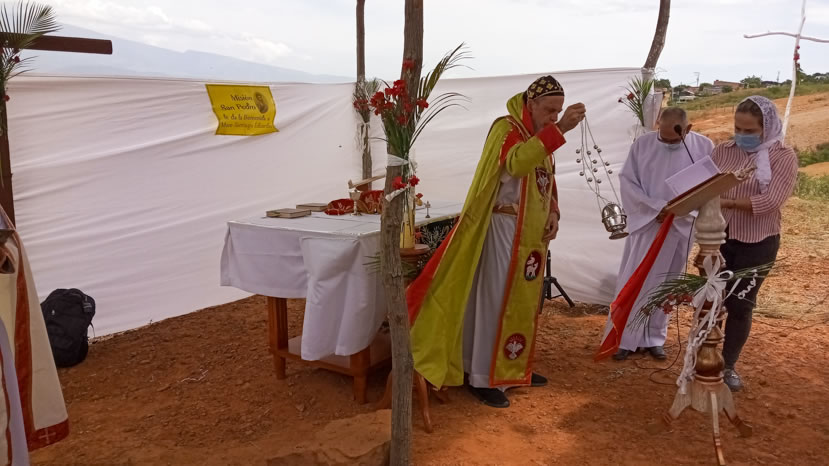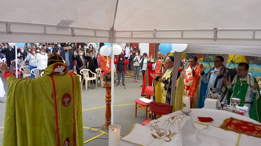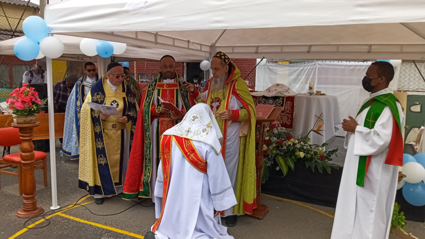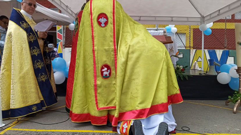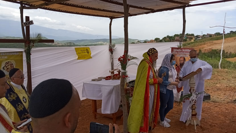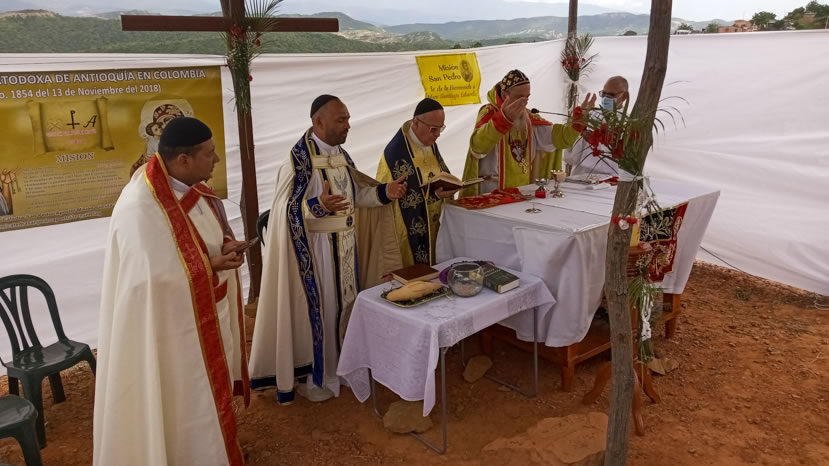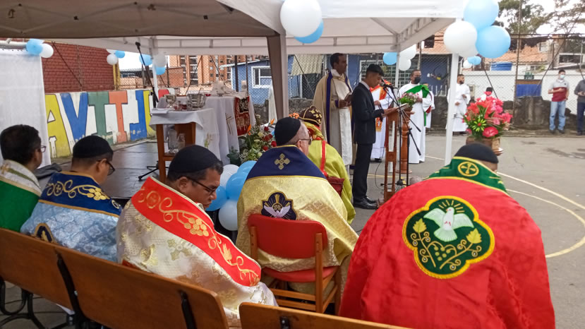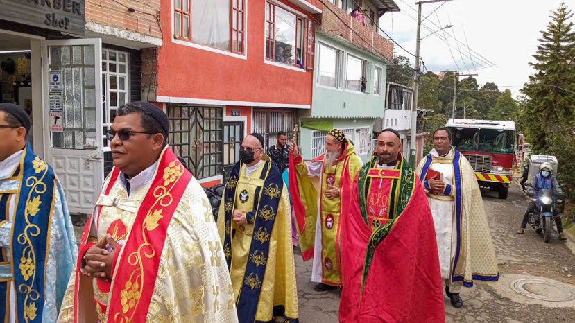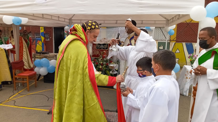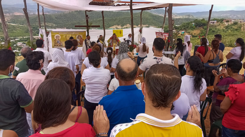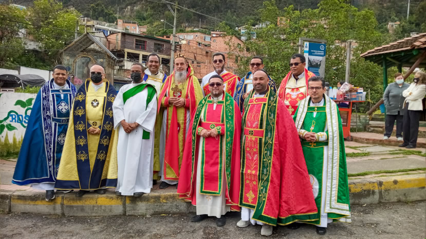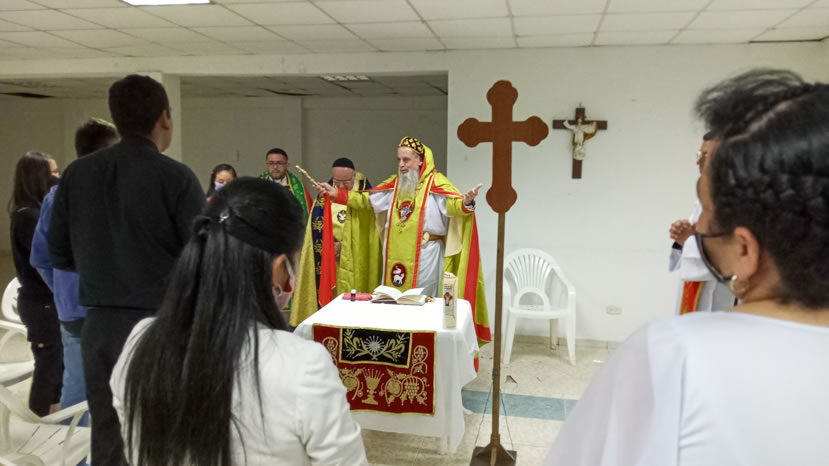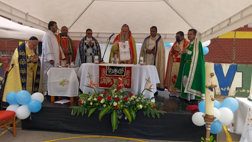Apenas llegados a la cancha deportiva de la comunidad Bosques de Calderón, inició la celebración de la divina liturgia, presidida por el arzobispo y en la que concelebraron los presbíteros de la vicaría de Colombia.