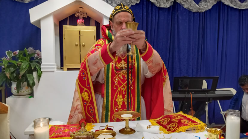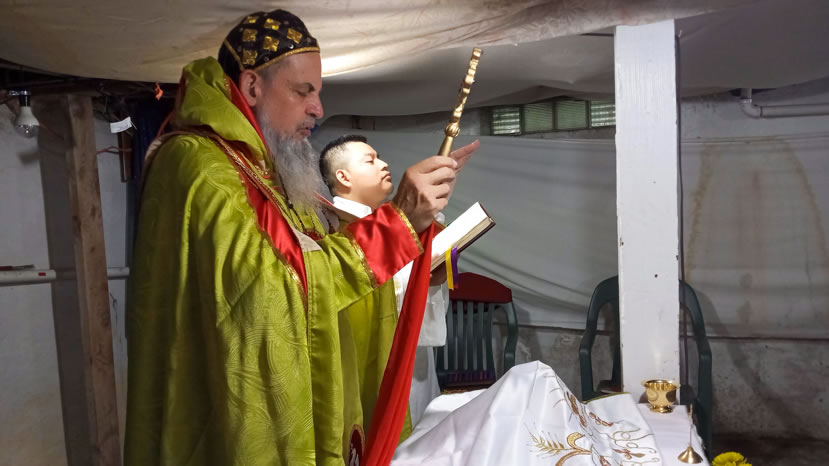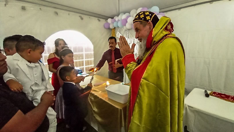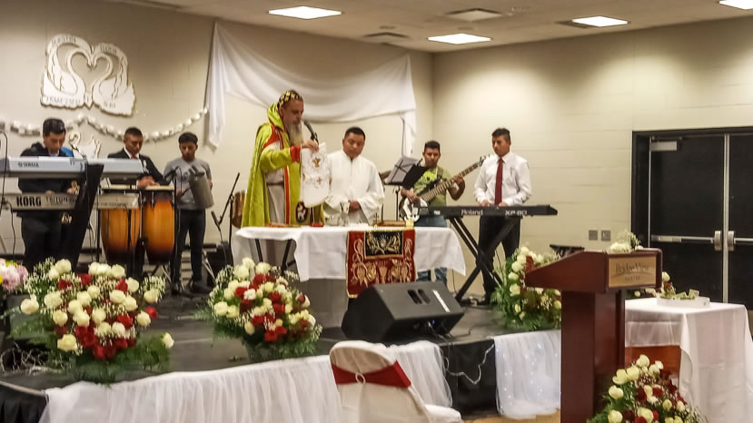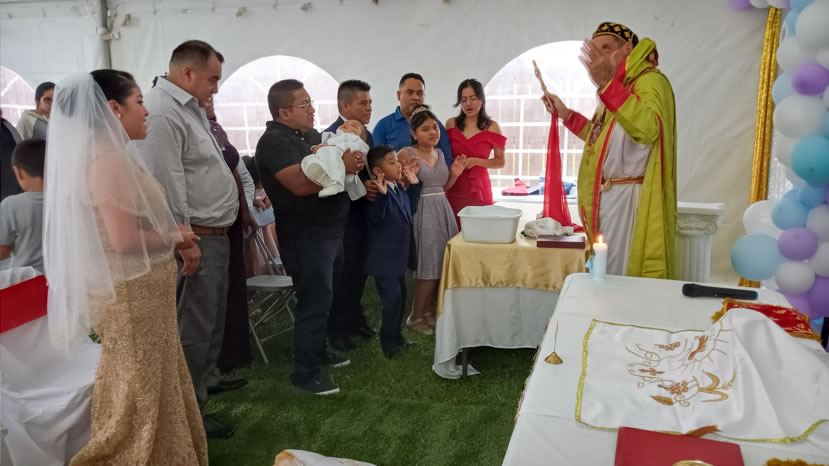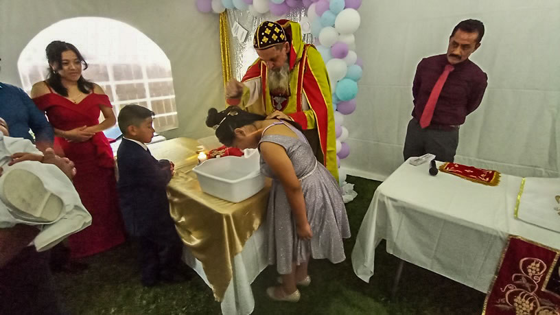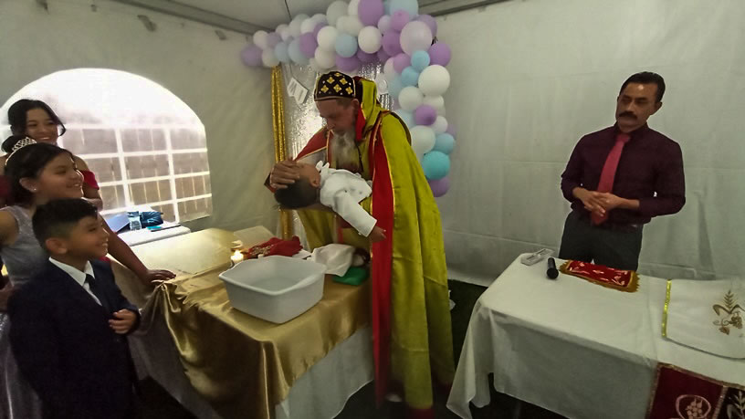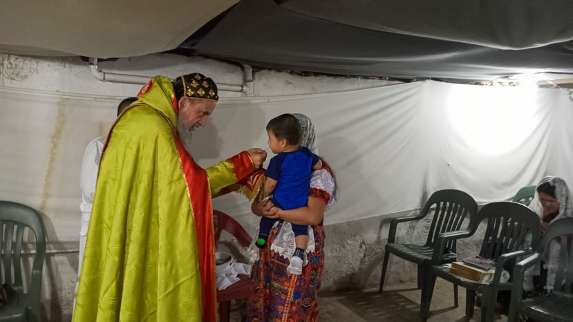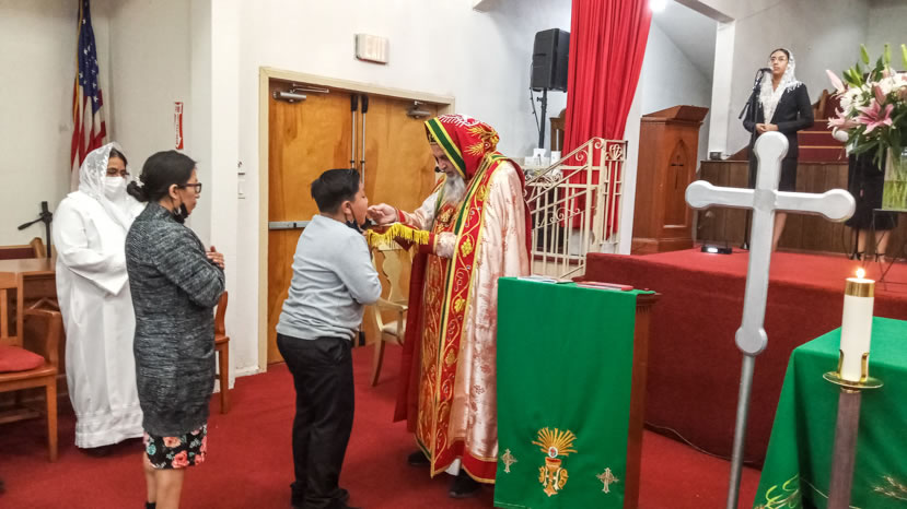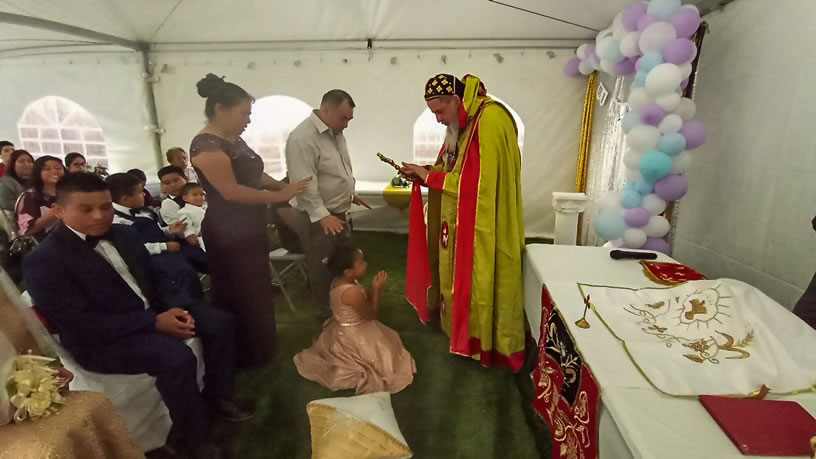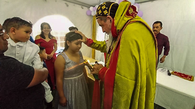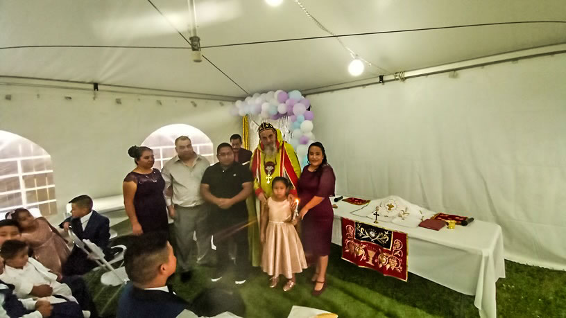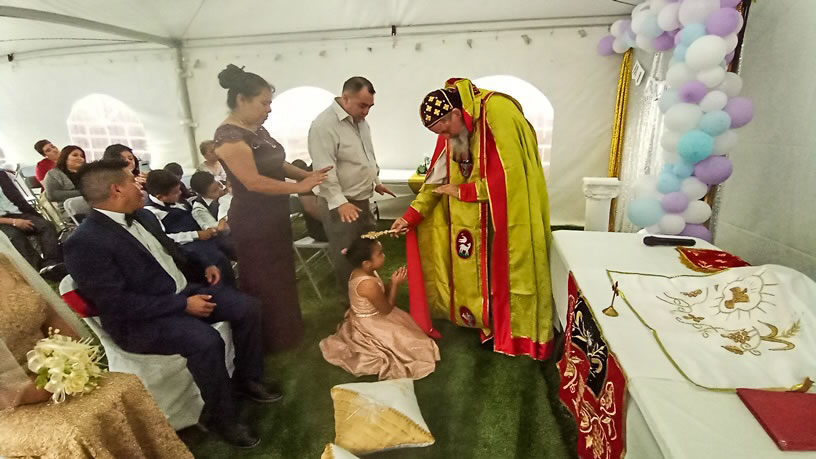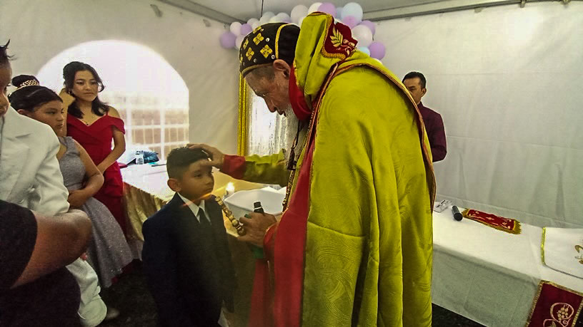 Dentro del marco de la celebración de la divina liturgia, se administraron los sacramentos de la iniciación cristiana a cuatro hermanos: un adulto, Jonathan, cuyo matrimonio también sería celebrado, sus dos hijos, y el hijo de otra familia, cuyo matrimonio había celebrado en la primera visita que el arzobispo había hecho a la comunidad.