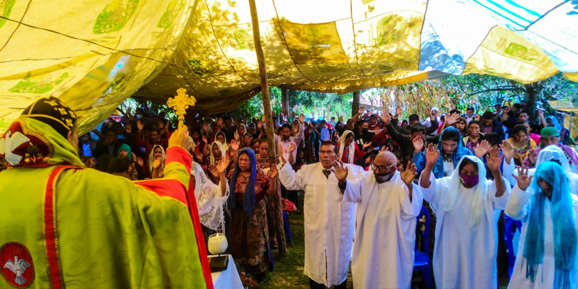 Progresivamente se fue juntando una multitud de hermanos que daban le bienvenida al arzobispo, quien caminó con ellos a lo largo de la aldea, hasta llegar al templo. |