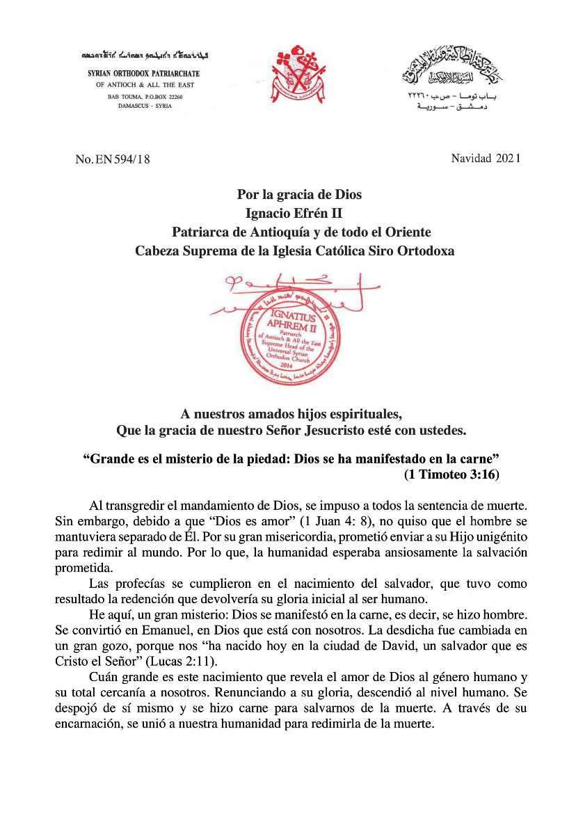 El viernes 24 de diciembre, Mor Santiago Eduardo recibió una carta de Su Santidad el Patriarca Ignacio Efrén II, con ocasión de la Navidad y del Año Nuevo.
