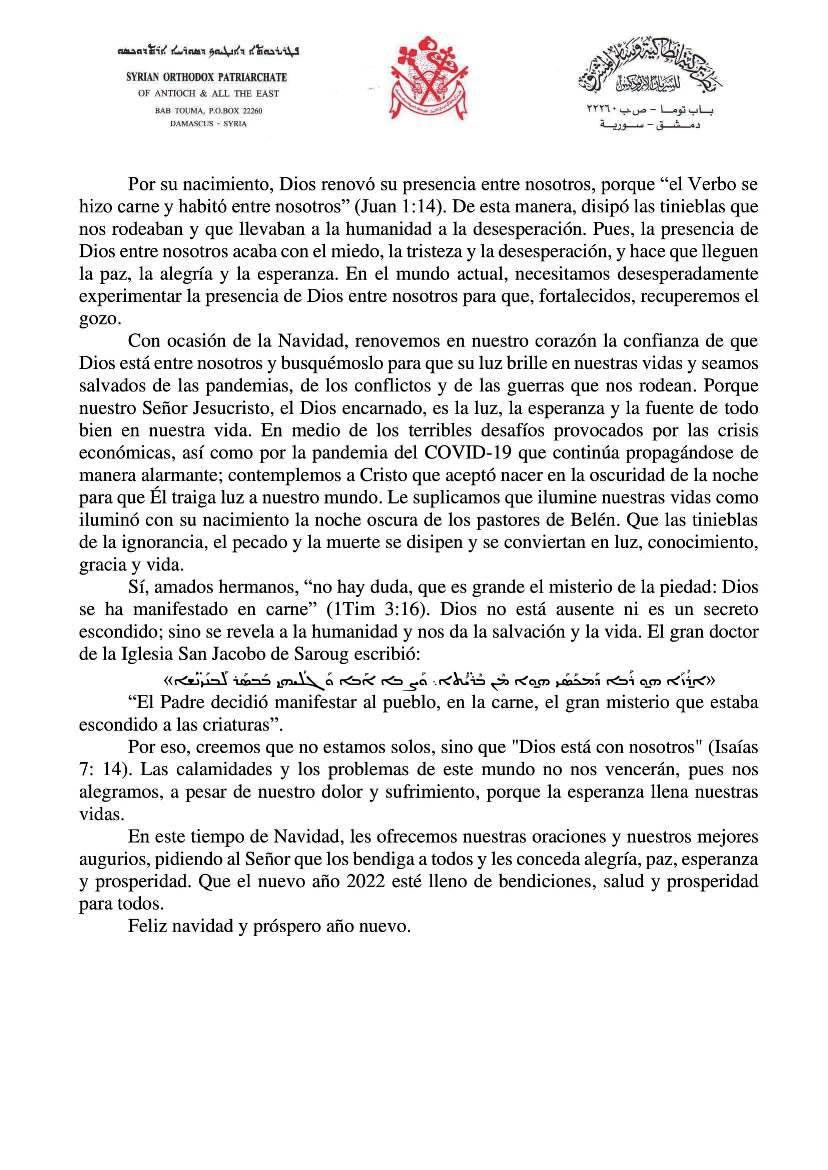 | 22: MENSAJE DE SU SANTIDAD EL PATRIARCA CON OCASIÓN DE LA NAVIDAD 2021 Y EL AÑO NUEVO 2022. |