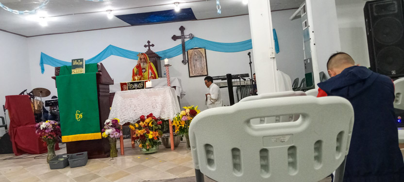 La visita a la comunidad comenzó con la administración del sacramento de la reconciliación a quienes lo necesitron. El hecho de que la energía eléctrica faltara en toda la región, condicionó externamente la celebración. |
