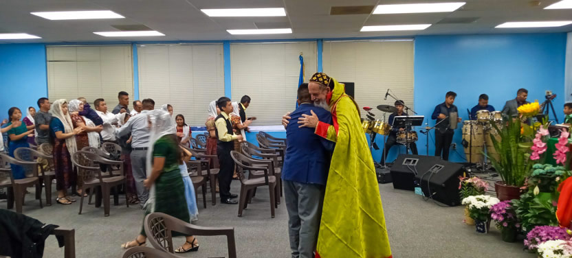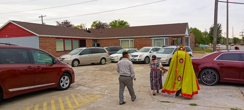 El viernes 1 de julio, por la noche, el arzobispo llegó hasta el aeropuerto de Champign-Urbana, en donde el hermnano Baltazar y su hijo Olardes le recibieron e inmediatamente le llevaron a conocer el nuevo templo que han comprado.