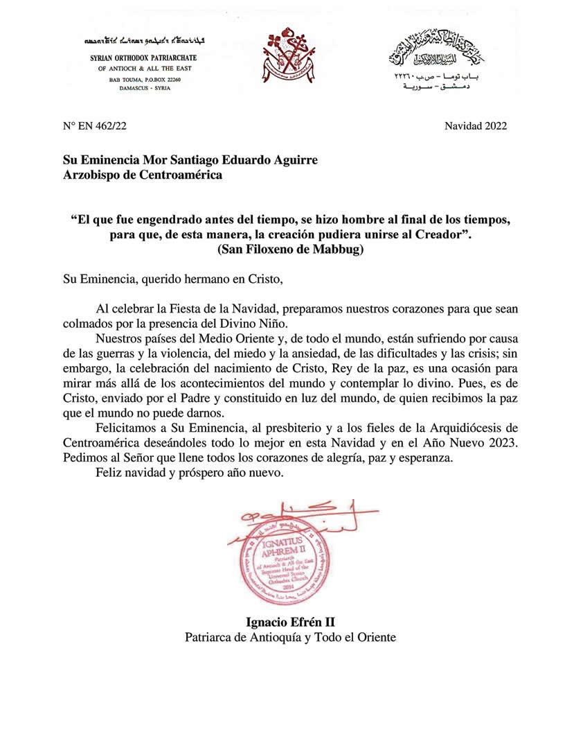 Con ocasión de la celebración de la Navidad y el Año Nuevo, Mor Santiago Eduardo envió una carta de felicitación en nombre propio, del presbiterio y de los fieles de la Arquidiócesis a Su Santidad el Patriarca Ignacio Efrén II, al igual que a todos los miembros del Santo Sínodo de Antioquía.