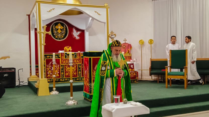 Se Eminencia Serapión presentó a Mor Santiago Eduardo una cruz bendicional de estilo copto y un bastón. Mor Santiago Eduardo, presentó una copia de la Liturgia Solemne de la Arquidiócesis de Centroamérica. |