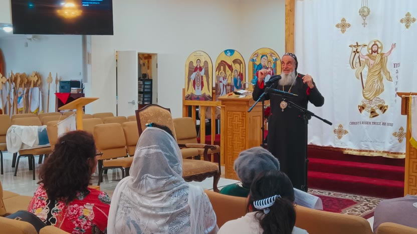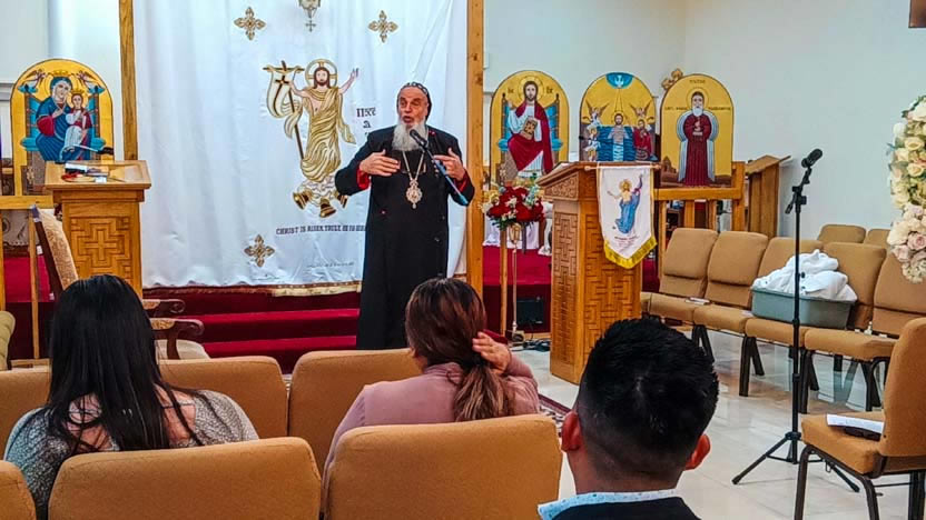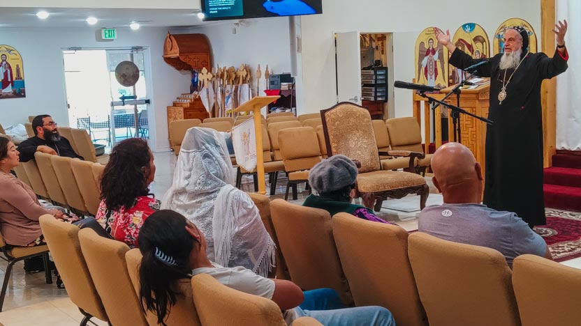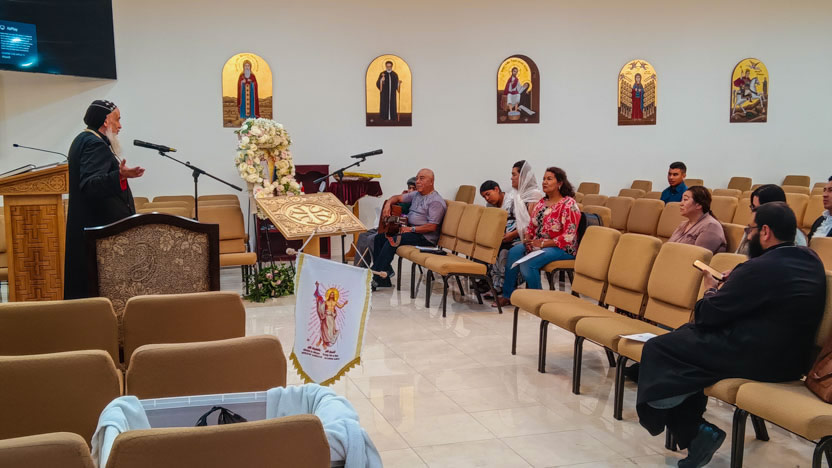 La razón para la visita del arzobispo a la parroquia copta fue la invitación a orar y compartir algunas reflexiones sobre la Sagrada Escritura con el grupo latino de fieles.