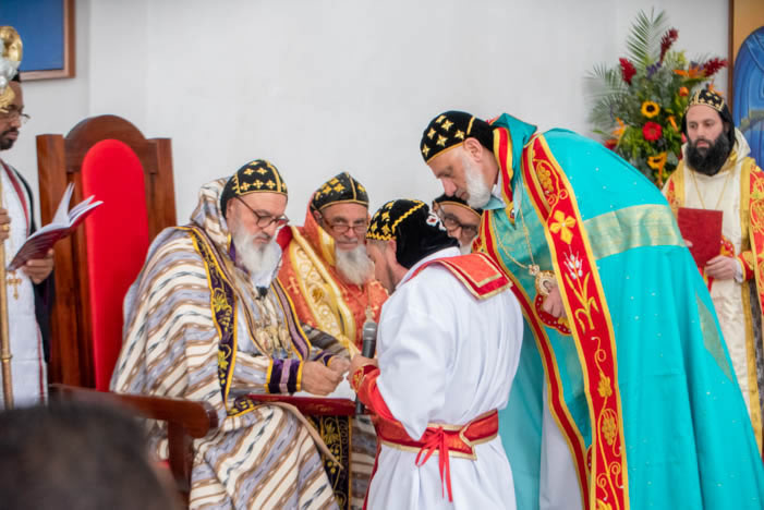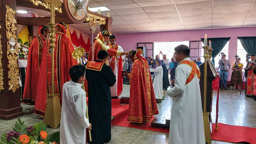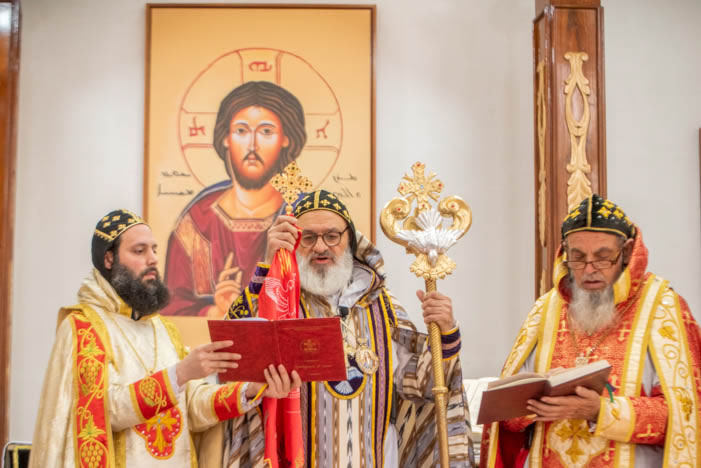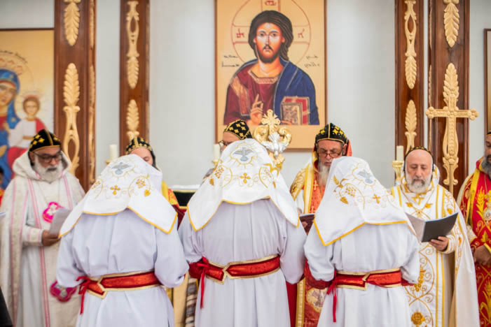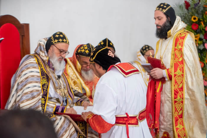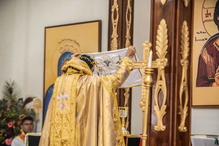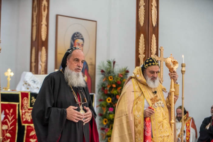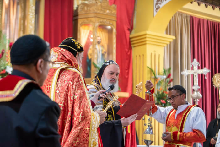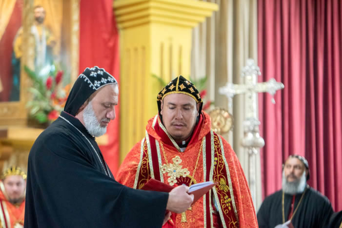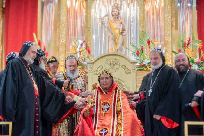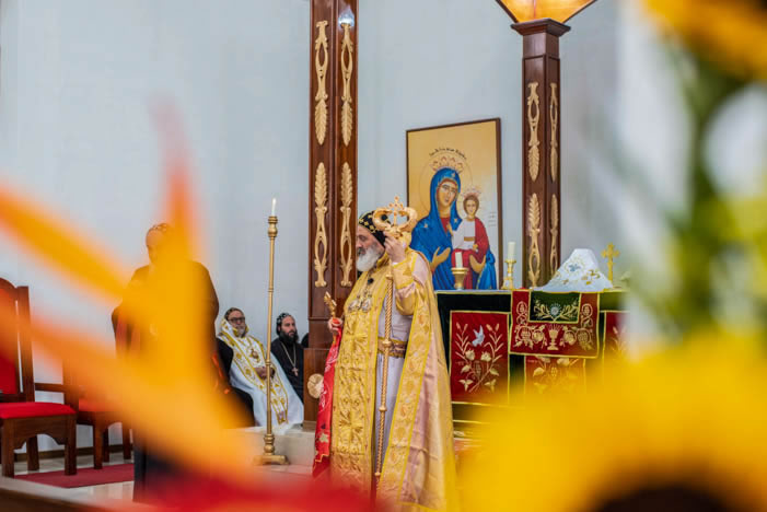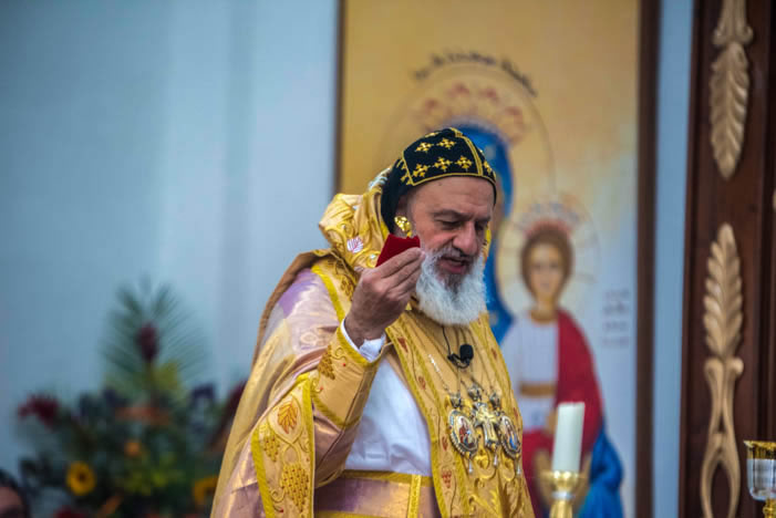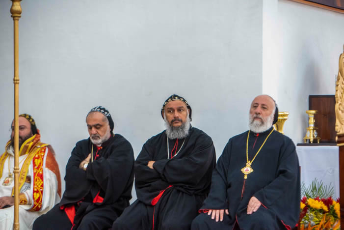 Antes de la comunión con los divinos misterios, como está previsto por el ritual de la Iglesia Siro Ortodoxa, el arzobispo presidió los ritos sacramentales de entronización de Su Gracia Mor Marcos Caicedo, como primer obispo de la diócesis del occidente.