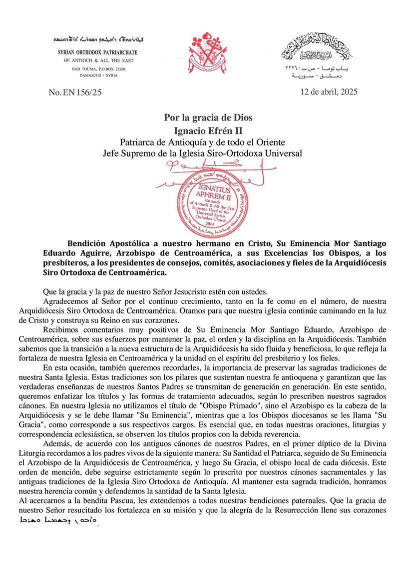 Además, de acuerdo con los antiguos cánones de nuestros Padres, en el primer díptico de la Divina Liturgia recordamos a los padres vivos de la siguiente manera: Su Santidad el Patriarca, seguido de Su Eminencia el Arzobispo de la Arquidiócesis de Centroamérica, y luego Su Gracia, el obispo local de cada diócesis. Este orden de mención, debe seguirse estrictamente según lo prescrito por nuestros cánones sacramentales y las antiguas tradiciones de la Iglesia Siro Ortodoxa de Antioquía. Al mantener esta sagrada tradición, honramos nuestra herencia común y defendemos la santidad de la Santa Iglesia.