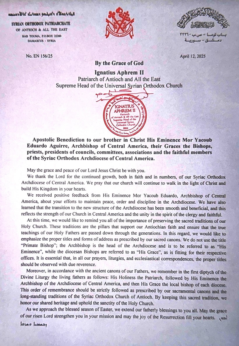 Bendición Apostólica a nuestro hermano en Cristo, Su Eminencia Mor Santiago Eduardo Aguirre, Arzobispo de Centroamérica, a sus Excelencias los Obispos, a los presbíteros, a los presidentes de consejos, comités, asociaciones y fieles de la Arquidiócesis Siro Ortodoxa de Centroamérica.