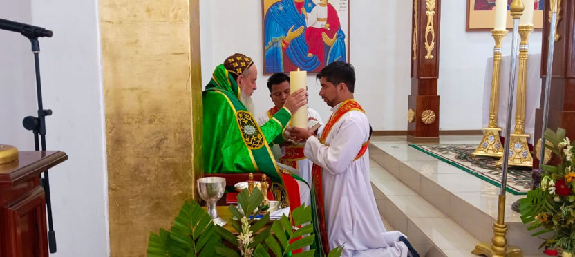 El arzobispo, después de presentarlos al pueblo, les entregó el cirio encendido y los símbolos para la preparación del altar, para la celebración de la divina liturgia. |