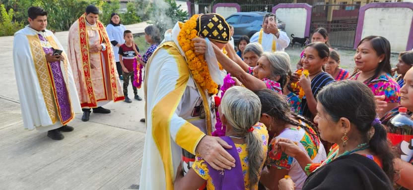 De acuerdo a la tradición cultural, la bienvenida se dio colocando collares de flores sobre el arzobispo y los presbítero. |