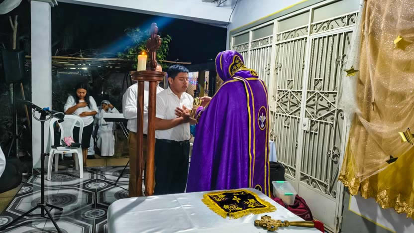 Por la noche, el arzobispo fue recibido en una comunidad que se reune en una casa en la zona periférica de la ciudad de Ahuachapán, para celebrar los divinos misterios.