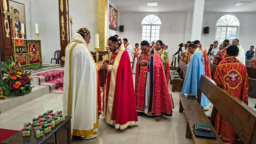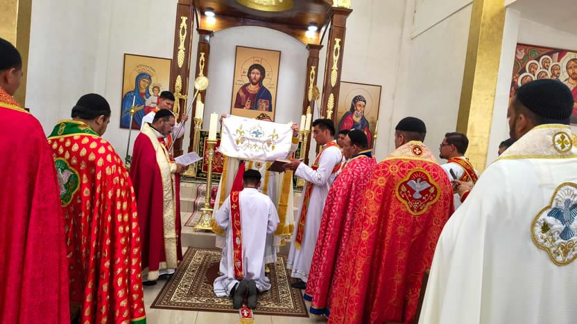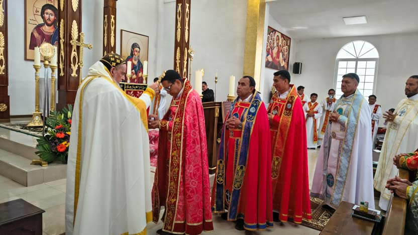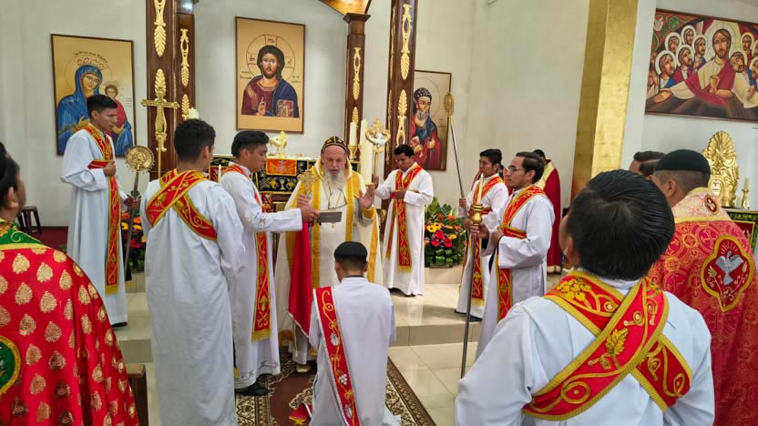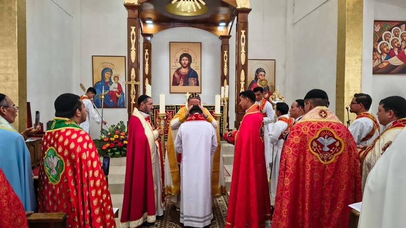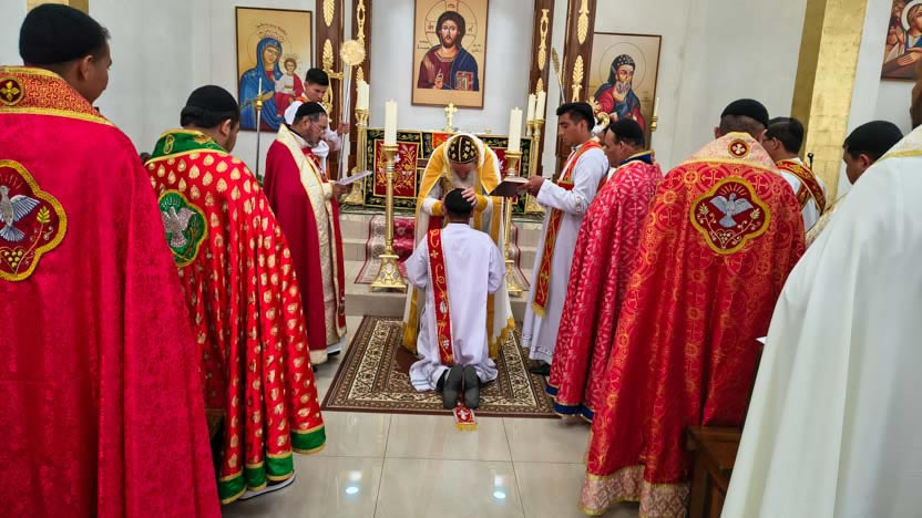 Al final de la ordenación, el arzobispo colocó el firo en la cabeza del neo presbíteros y los presbíteros elegidos, hicieron la vestición con los ornamentos presbiterales.